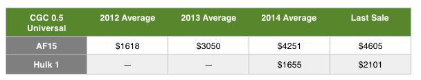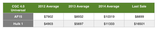 In 2012, AF #15 was trading at a 61 percent premium to the same graded Hulk #1. In 2013 the gap was still 56 percent.