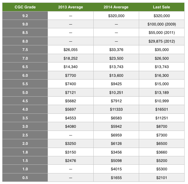 A quick glance at the above data shows another grade which has NOT taken off in value, for whatever reason. CGC 1.8 examples are basically trading at the same price they did two years ago ($3660 vs $3150).